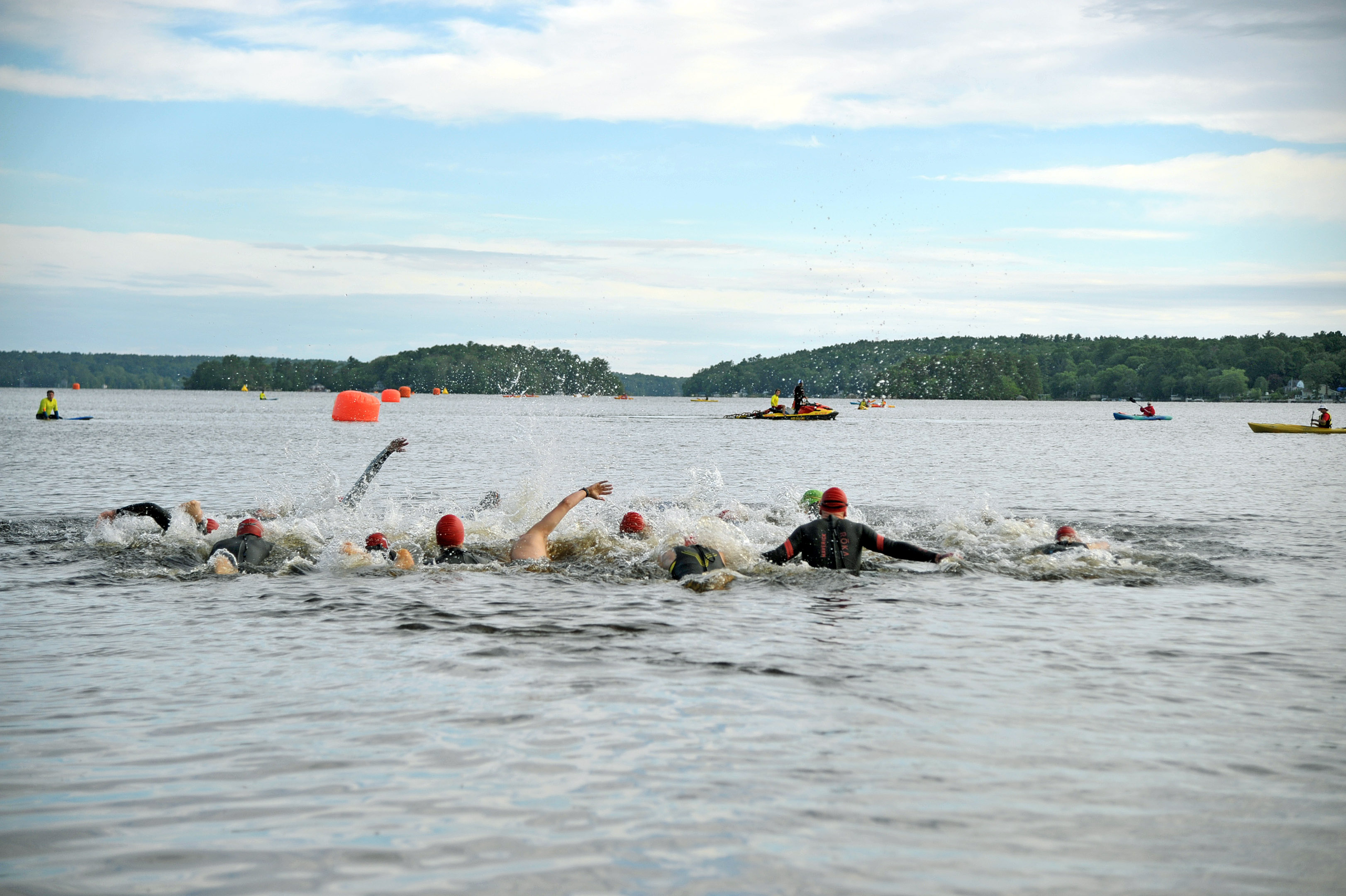 I think the last time I was in a mass start was the first triathlon I ever did which made me a little nervous. The group was only about fifteen athletes, so I lined myself up toward the front. My swim is generally really strong compared to the field most, so I figured I would probably get off the front with one or two others before that group broke up. The horn went off and my guess turned out right. I went very hard off the line with everyone else and the group broke up before I knew it. I hung on to the leader’s feet for a couple hundred yards before deciding the pace was more than I was going to be able to hold. I was by myself after that (per usual). I think this was the calmest swim that I can remember. The wind was coming from the west and any chop was blocked by a peninsula until the turn buoys. Swimming into the chop was a drag, but it wasn’t terribly long. It was a clean shot to the end after that second buoy. I could feel myself getting tired on that return leg. I refused to give myself any excuses and hung in until the end. I held on to second out of the water and ran past the wetsuit strippers into transition.