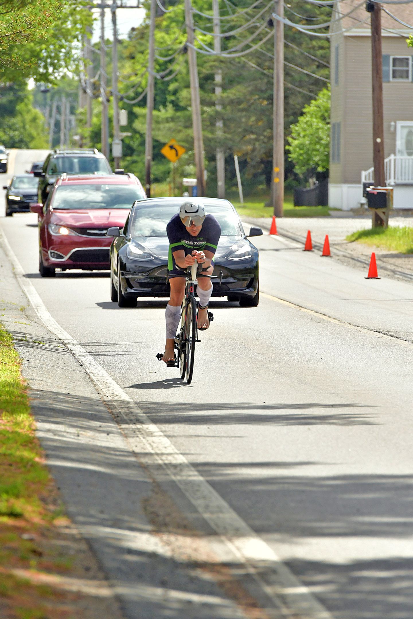 I cruised into T2 as the race leader and had another lackluster transition. Again, I wanted to make sure to get everything set up right and ready for what I knew would be the toughest leg. I ran out of transition with no one in sight still and got to have one of my Boston Tri Team teammates as the volunteer leading me on the bike.