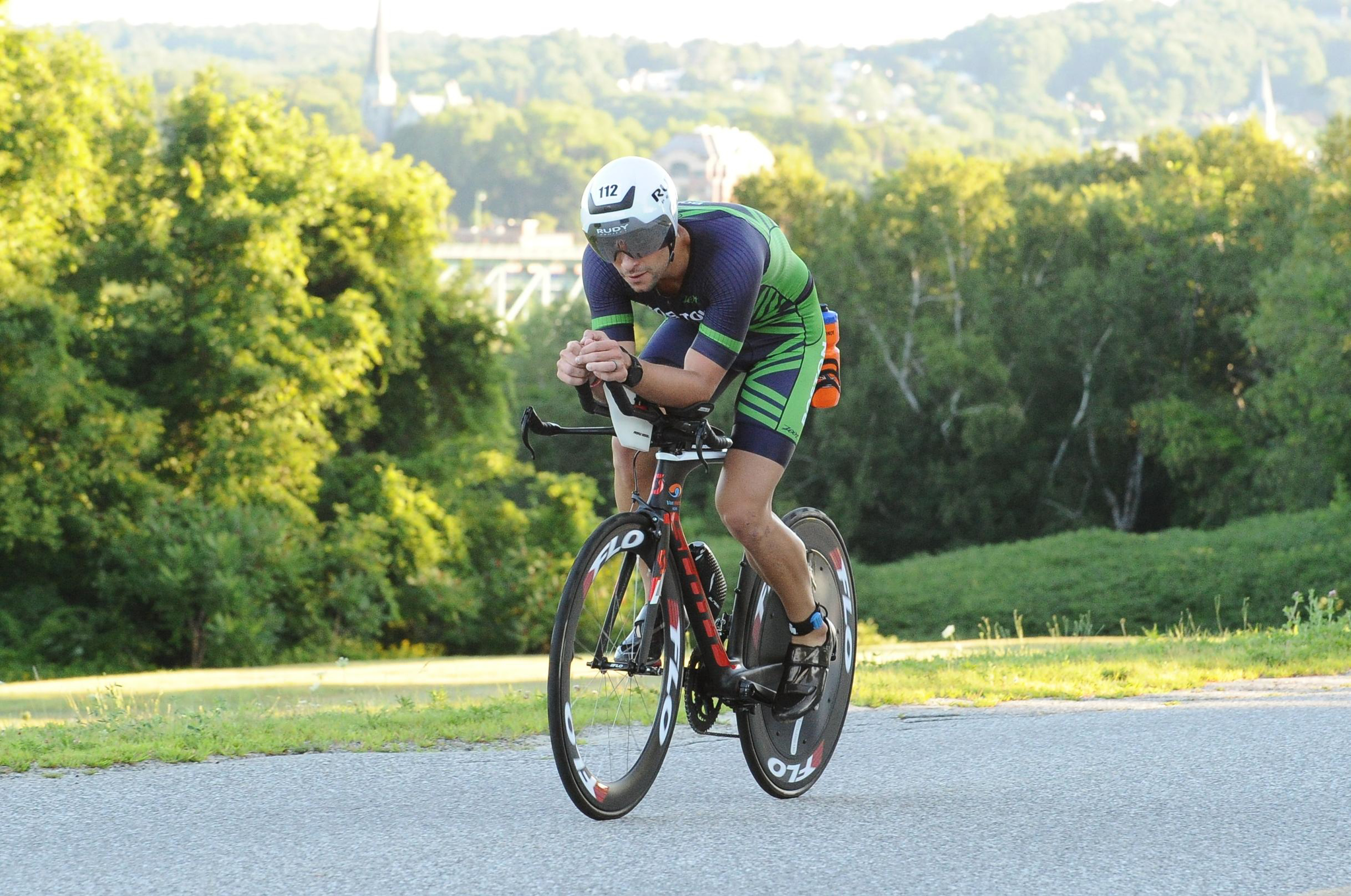 The initial stretch of road was rough. I hit a couple bumps and felt something bounce off my knee. When I looked down I saw that I had ejected a couple Gu’s. I just barely caught the third one that was on its way out and shoved it in my trisuit pocket. I heard something else bounce on the road, but didn’t think too much of it. Once I was around the corner heading onto the bridge I realized what the noise was. My flat repair kit ejected itself too. There was no panic. I just said to myself that I just had to ride the course perfectly and hope for the best. I cranked up the hill after the bridge and made the first pass on my way out of town. I made one more pass and then was by myself for a while and had a bunch of fun cruising up and down the rolling hills. There were way more people hanging and cheering out at the ends of their driveways than I expected. It was great to see so much of the community out supporting. There were a couple points where my mind started to wander a bit and I think it was from straight mental fatigue going into the race. The couple times I got passed were during those lulls, which thankfully snapped my attention back to the task at hand. I’m sure they would have caught me either way, but it was a bit frustrating. There was one more guy that passed me with about 15 to go and I got him back when he slowed down to eat on a hill a couple miles later. He got around me with about 5 to go and I let him go knowing the last few miles were going to be on pretty rough road and I didn’t want to wreck my legs chasing going into the run.