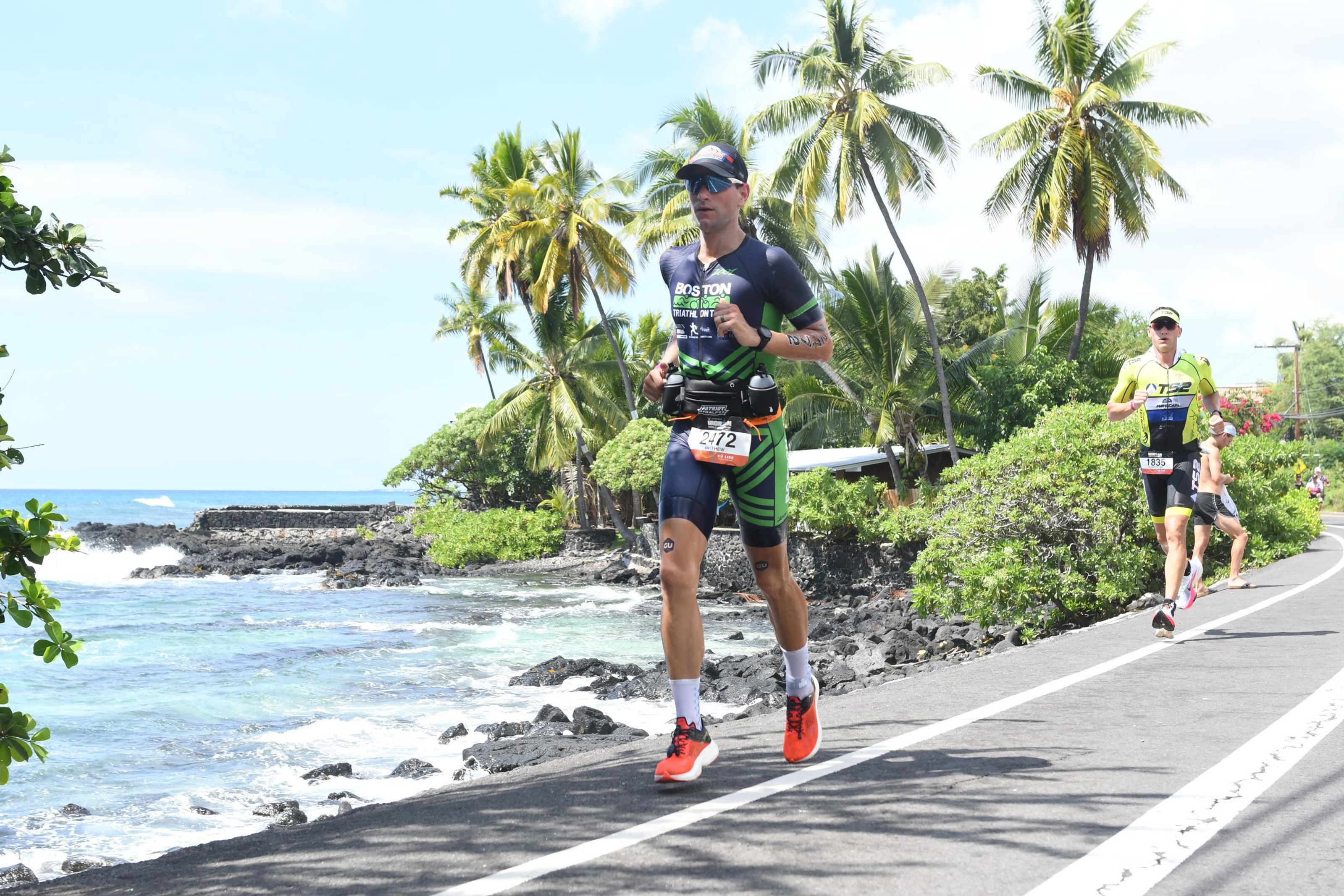 My stomach was still pretty ragged and my legs were feeling the miles. I’m almost a little grateful that I didn’t feel great since it made it mentally easier to stick to the pace plan. The target seemed pretty slow but I had no idea what would happen once things got real. The run down Alii was pretty cool with tons of spectators and a bunch of houses spraying runners with hoses. I just clicked off the miles on target letting people pass me without giving them a 2nd though. I was only a little surprised to see people breathing heavy and starting to blow up in the first 7 miles. I power walked through each aid station to make sure to get my hydration down and some ice in my suit. I saw Colin looking strong going one way down Alii as I was going back up and there was a quick fist bump. My stomach was finally coming around when I turned up Palani hill and I started the quick shuffle up that. Colin’s advice to go slow slow up that rang in my ears and I followed the instructions keeping my heart rate as low as I could. It helped that there was an aid station in the middle to walk through too. That was the point I decided the water belt was doing more harm to my stomach than any other good so dunking it into the trash can was pretty satisfying.