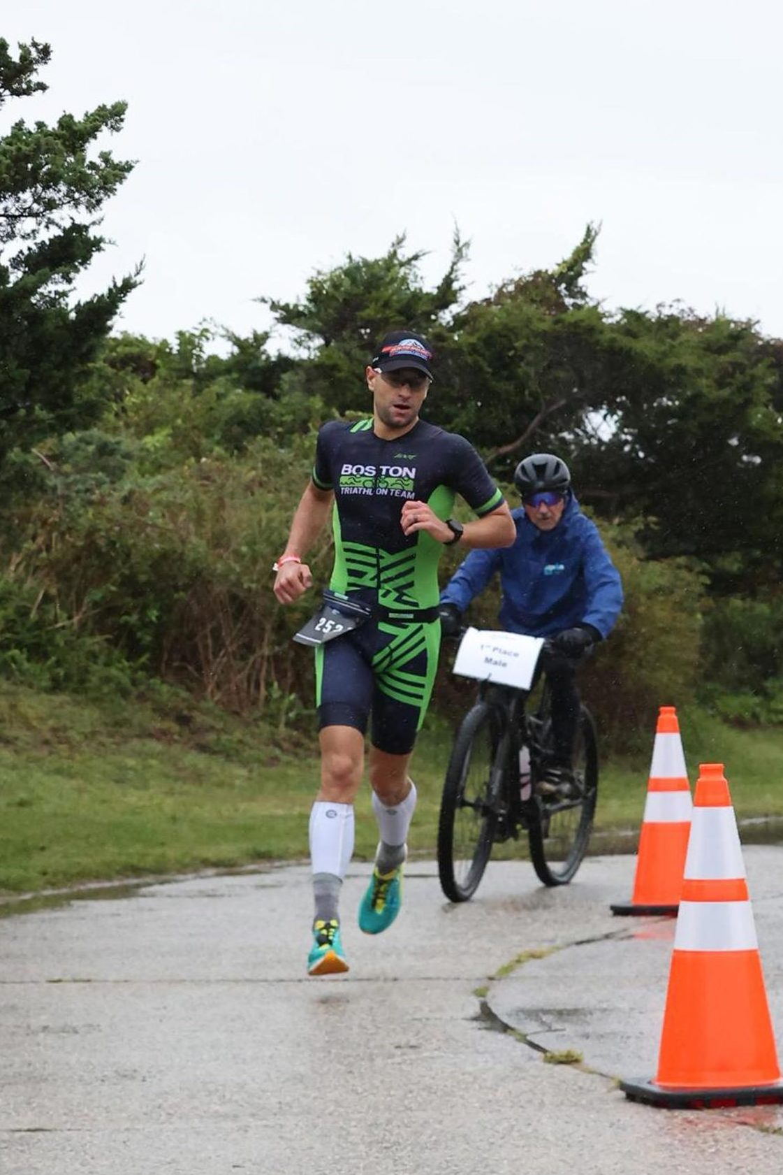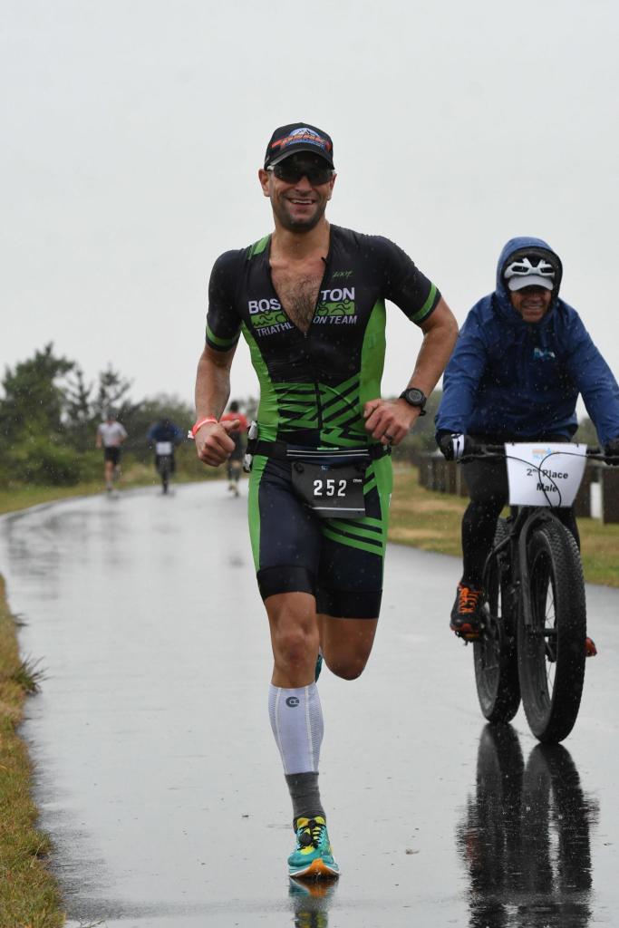 I went out about on pace and was quickly told I was leading by the bike escort. I guess the guy who got away on the bike was a relay. The leg out was downwind which was helpful. It turned out a lot of the run was on a wood boardwalk which was pretty slippery. Even the concrete sections were fairly slippery.