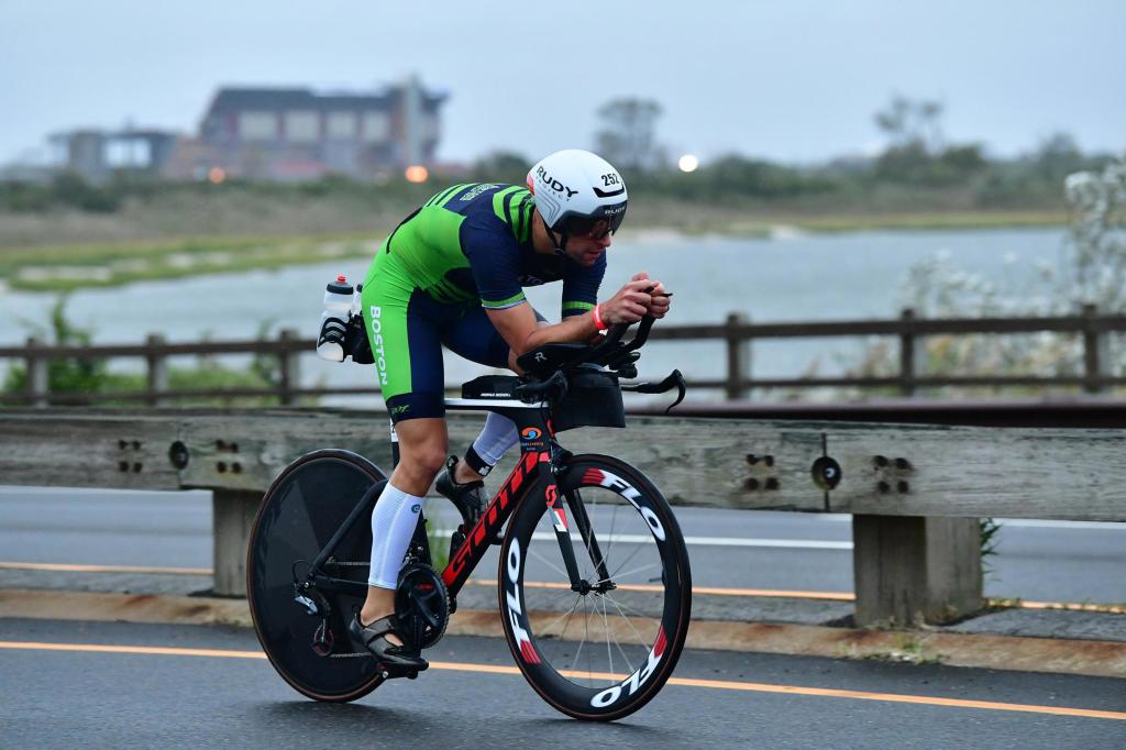 Ironman shortened the course to 750m about twenty minutes before the start which was a bummer but the right call. The chop was pretty crazy even in the bay. I probably would have been fine, but I thought there was strong chance someone would get hurt. I made the best of it and lined up toward the front. I looked toward the swim exit to see if there was anything good to sight off of. There was a bathhouse and an ambulance flashing its lights. I hoped that the ambulance would still be there on the return but didn’t want to count on it. They had us step up to the chutes before I could pick out anything else to look for.
