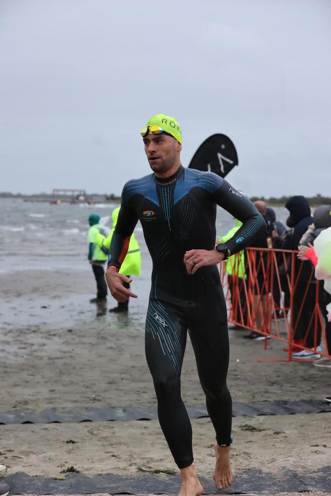 The return was wild. It was basically body surfing to shore for a couple hundred meters. I got pushed a little off course but I don’t think it made more than 10-15 seconds of difference. Sighting with the waves was really hard. Thankfully the ambulance was still there and I got a good look at it with about 250 to go. That let me give up trying to spot the buoys.