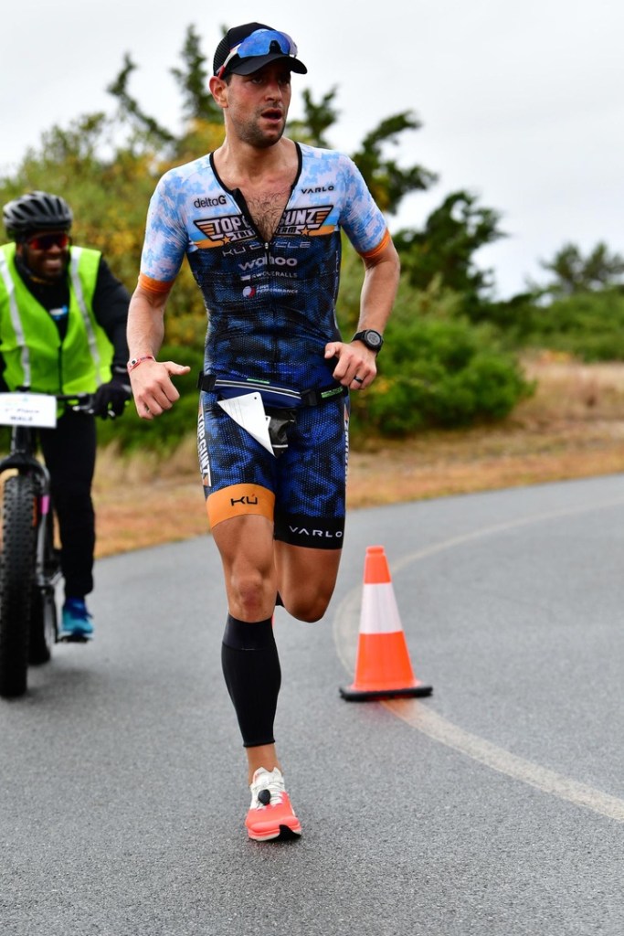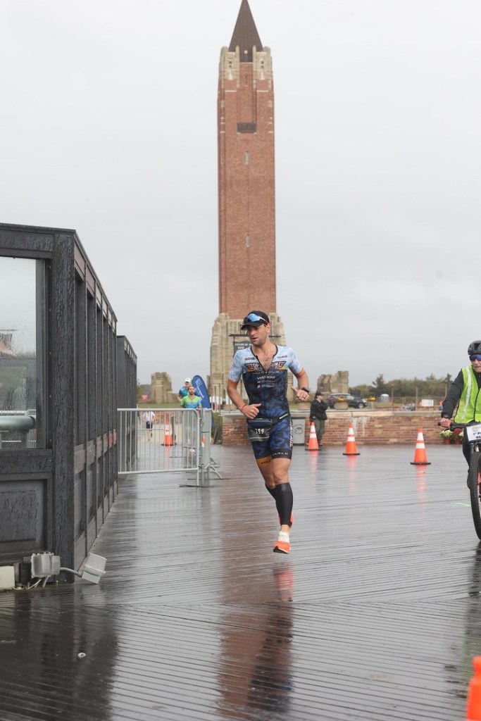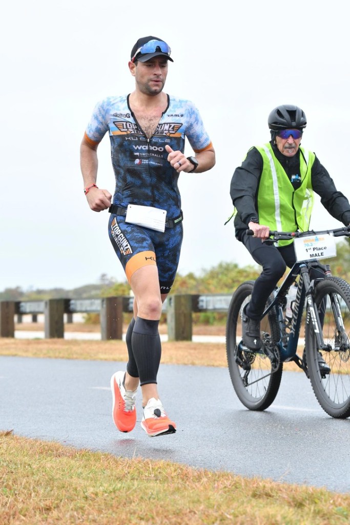 My dismount was about as ungraceful as my mount. The wind seemed more violent than it had been before. I jogged into transition with the bike and saw my mom by the side of the course cheering. I racked the bike, took my helmet off, and took a quick breath to recenter myself. I knew I had a decent gap, but there was no way to know whether it would be enough. I didn’t want to get ahead of myself and go out too hot running scared.