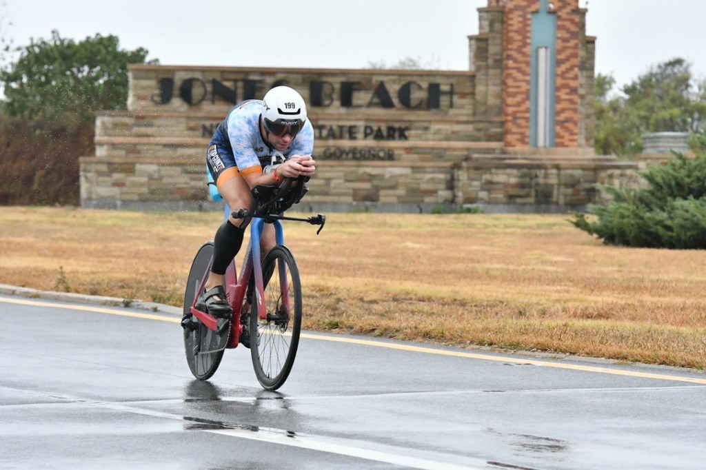 We rolled out around 4:50 and made it to Jones Beach a few minutes before transition opened. It was already windy and raining. Staying dry was a lost cause, so trying not to get too cold was the priority. It only took about 10 minutes to air up my tires and set up my gear. I opted to drop my tire pressure a couple psi for the wet roads. I took a few moments to double check that everything was in its place and mimed a couple transitions before starting to head back to the car to drop my mostly empty bag.