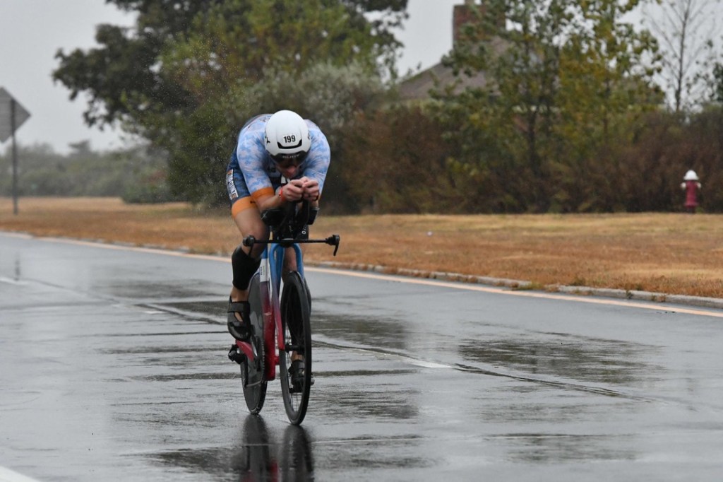 I got to my bike and the bottom half of my wetsuit came right off. I don’t know what I was thinking when I set up my transition spot, but I had left my helmet upside down to fill with rain. It was nice and soggy when I put it on my head. I grabbed my bike and headed for the mount line.